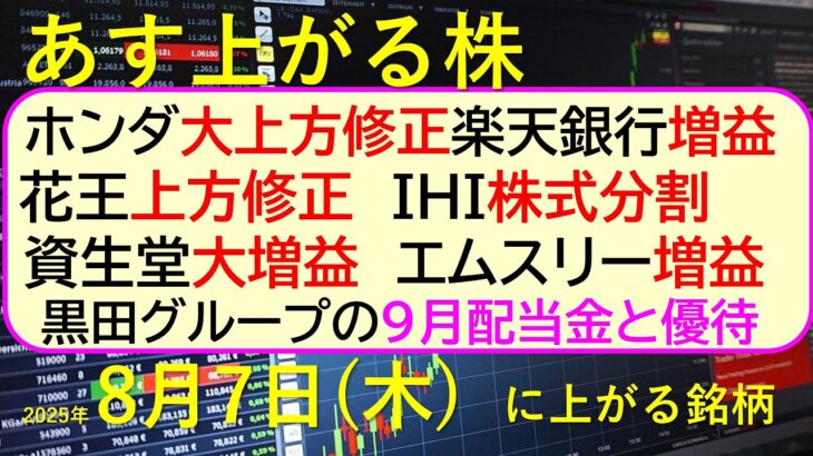 ホンダ大上方修正。楽天銀行増益。花王上方修正。IHI株式分割。資生堂大増益。エムスリー増益。黒田グループの9月配当金と優待。 ~あす上がる株。最新の日本株情報。高配当株の株価やデイトレ情報~ ★YouTubeメンバーシップへの参加リンク https://www.youtube.com/channel/UC5Qgc-tEFmm5iQX5tUy6TyA/join ◆メンバーシップのご説明 ɦ […]